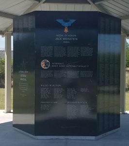 A portion of the front panel of the Memorial is dedicated to Sergeant Jack Weinstein, a Korean War veteran from St. Francis. Weinstein was honored posthumously in 2016 with the Medal of Honor, the Unites States Armed Forces’ highest military decoration, awarded to recognize American Soldiers who have distinguished themselves by acts of valor.